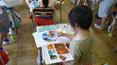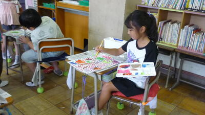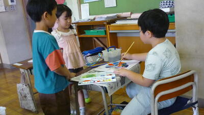 1年生の教室に、パレット片手に絵を描く小さな画家さんがたくさんいました。
