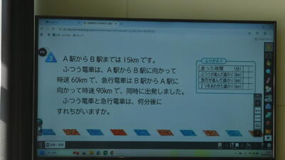 「速さ・時間・道のり」の関係は、大人になっても日常生活でよく使う大切な単元。子どもたちは、文章から必要な数を考え、集中して問題に取り組んでいました。