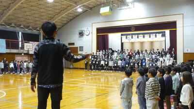 体育館にて「6年生を送る会」が開催されました。全校児童がこうして一堂に会するのは今日が最後となります。会場には6年生の保護者の皆様も大勢駆けつけてくださり、あたたかな空気の中で会が始まりました。