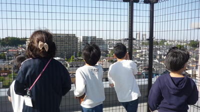 「マミーマートだ!」「ぼくの家はどこかな?」と屋上からの景色を楽しむ子。