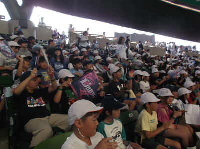 午後はいよいよ全校児童でベルーナドームへ。日本ハムファイターズを相手に、練習してきたチャンステーマを歌い、応援しました。