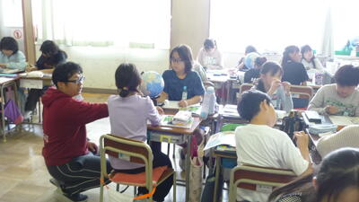 一方、5年生の社会では、地球儀を囲んで熱心に話し合い。